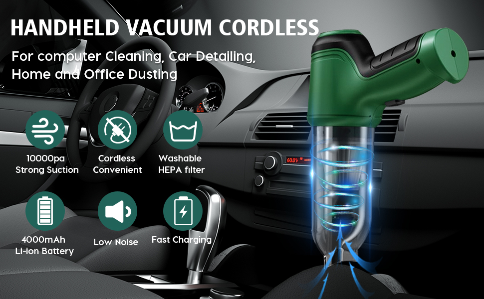 🔋【Fast Charging & Long Using Time】This hand held hoovers cordless has built-in 4000mAh lithium batteries, and the motor speed is up to 9000PA,120W high power . This wireless hand held car cleaner can be full charged in 3-4 hours and run for about 20-30 minutes. Just one charge will meet your daily cleaning need.