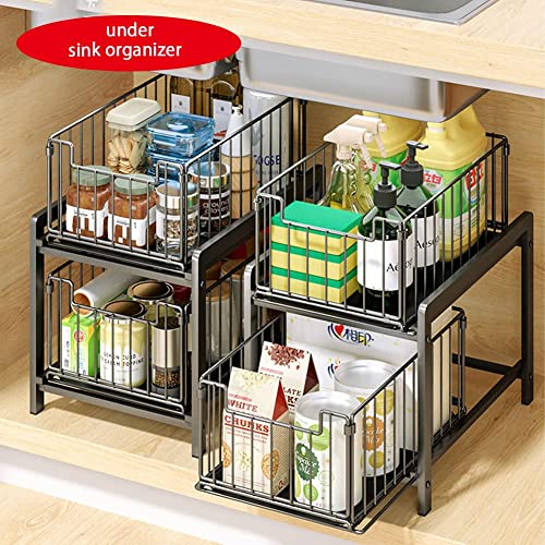 YunNasi Under Sink Storage 2-Tier Pull Out Sliding Basket for Cabinet Kitchen Cupboard Organiser Detachable Metal Storage Rack for Bathroom (Regular, BlackBlack)