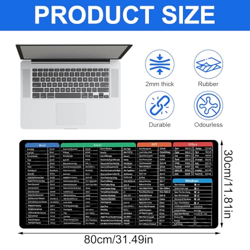 - LARGE MOUSE PAD: This excel shortcuts mouse mat measures 80x30cm/31.5×11.8 inches, the gaming mouse pad is large enough to accommodate desktop items such as keyboards, mice, notebooks, calculators, and is suitable for all types of keyboards and mice. At the same time, it provides enough moving space for the mouse to meet your daily office, gaming and study needs, such as using this gaming mouse pad as a desk mat, writing pad, platform protection pad