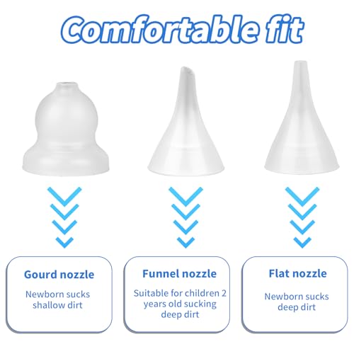 Multifunctional: There are three nozzle shapes, gourd-shaped, funnel-shaped and flat. Different shapes of nozzles can be used for different types of cleaning to effectively clean the dirt in the baby's and children's nasal cavity.