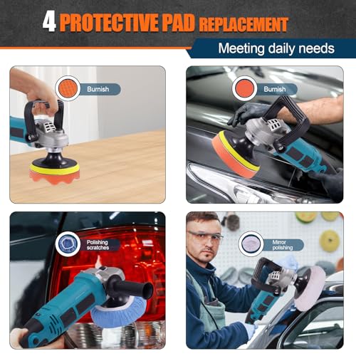 【Multi-functional application, one machine for multiple uses】Car polisher is equipped with a variety of accessories, including sandpaper, wax foam pad, wool polishing pad, etc., to meet different needs. Choose soft or hard foam pads to complete a variety of tasks, including polishing, sanding, waxing, sealing, removing swirls and minor scratches, etc. In addition, car buffer polisher machine is also widely used in the processing of furniture, ceramics, wood, aluminum, steel, tiles, plastics and other materials.