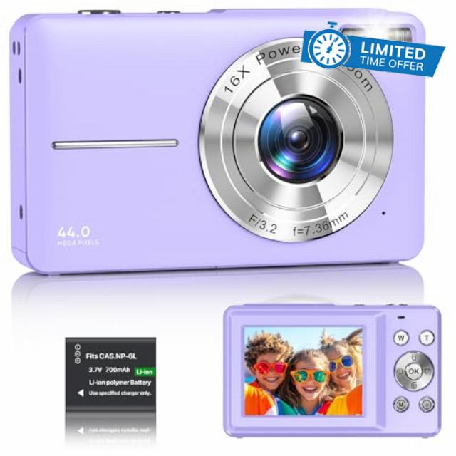 Digital Camera 1080P FHD Compact Digital Camera 44MP Portable Mini Small Photo Camera with 2.4″ LCD Screen, 16X Digital Zoom and 1 Battery Vlogging Camera for Kids, Girls, Boys-Purple