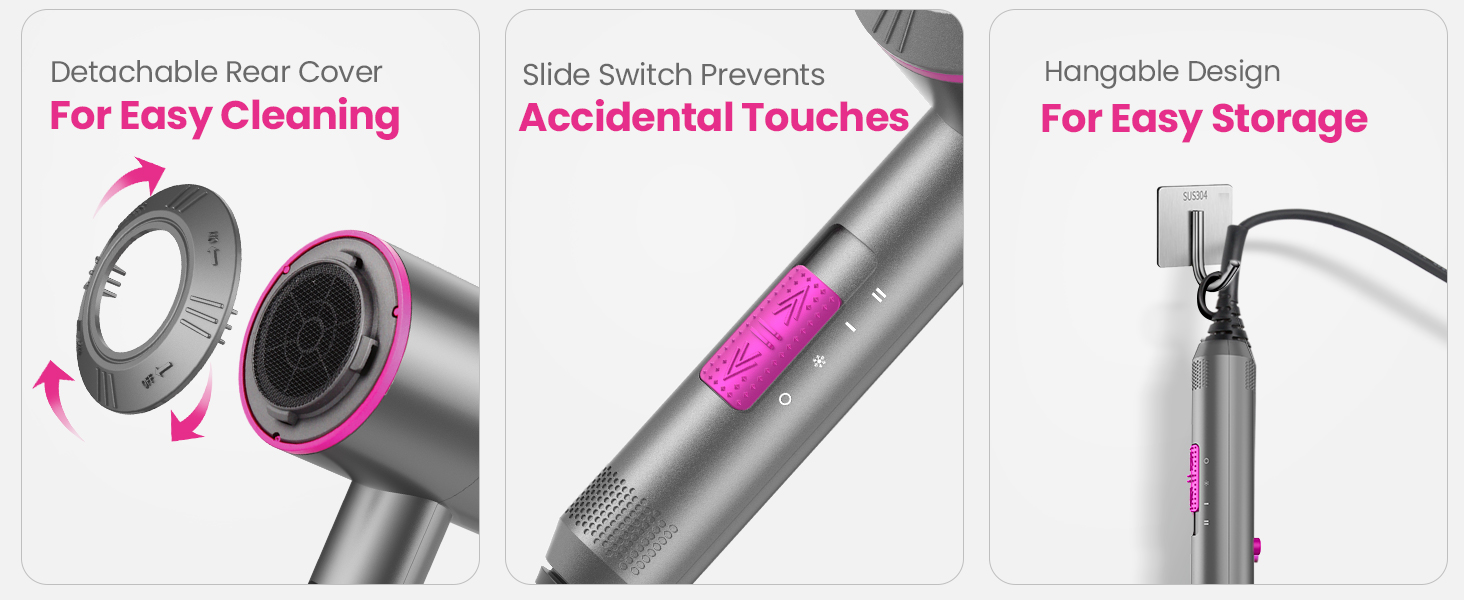 Customizable Settings for Your Needs – Tailor your styling experience with 3 heat settings (cold, warm, hot) and two fan speeds. Additionally, a convenient cold air button is available for setting your style in place. Remember, safety comes first—never block the air outlet or place the dryer face down during operation.