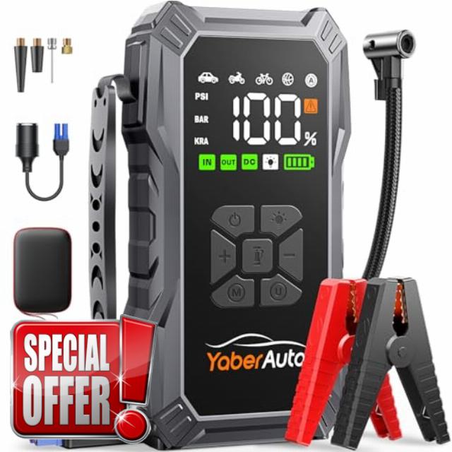 Jump Starter Power Pack with Air Compressor, YaberAuto 5500A Portable Car Battery Booster (All Petrol/10L Diesel), 12V Car Jump Starter Power Bank with Jump Leads, LCD Screen, Emergency Ligh