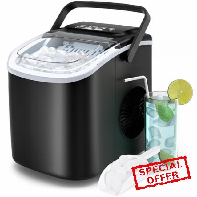 【Portable Design】 Our compact ice maker has a sturdy handle, making it easy to carry from room to room or even on the go. You can prepare ice anytime, anywhere—in the kitchen, office, bar, boat, RV, or any countertop with free space. The lightweight, reliable handle ensures effortless portability, perfect for parties, camping, tailgating, or grilling.