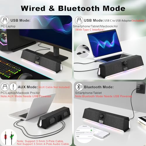 - 【USB Mode】Just plug in the USB port to power and play sound, press the "M" key to select "USB Mode", the pc speaker for desktop is widely compatible with various devices, such as PC, laptop, tablet, smart phone,USB-C device, etc.