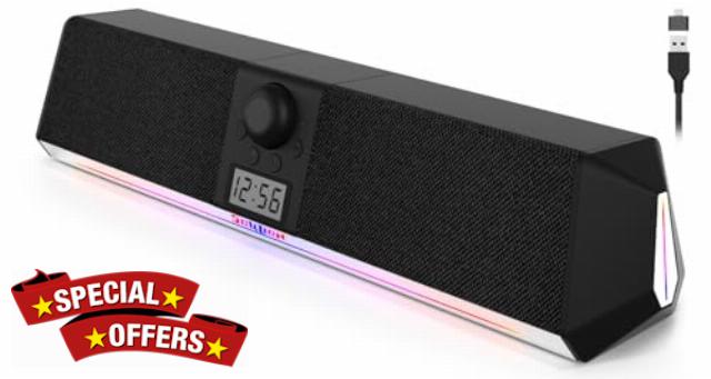 SOULION R80 Computer Speakers for Desktop, USB-powered PC Speaker with LCD Digital Clock, Bluetooth PC Soundbar with Colourful Lights for Laptop, Tablets, Smartphone
