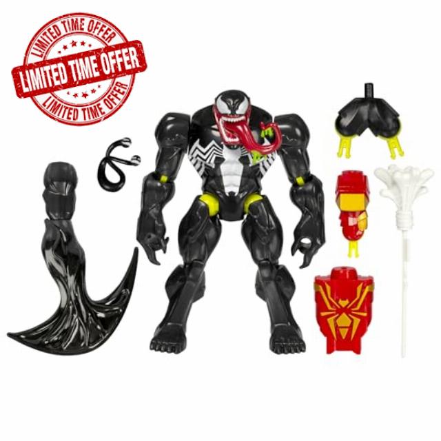 INCLUDES 4 IRON SPIDER PARTS: Marvel Venom deluxe action figure comes with 2 red-and-gold Iron Spider shoulder pieces, projectile launcher & projectile, plus 3 accessories, including a bendy arm and flexible symbiote