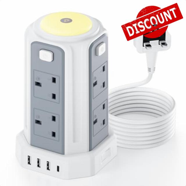 - 【17W USB-C Fast Charger】This tower extension lead features 4 USB ports with a maximum output of 3.4A/17W, delivering up to 30% faster charging speeds. Its compact tower design helps organise cables neatly while providing safe, rapid charging for all your USB devices.