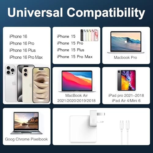 - Lightweight and Portable: This MacBook charger is lightweight and portable, making it perfect for use at home, in the office, or on the go. It includes a professional 2M/6.6ft USB-C to C extra long charging cable, allowing you to charge your devices flexibly and comfortably while working or relaxing. The UK plug adapter is detachable and interchangeable, and with its compact size and reliable performance, this MacBook charger ensures a smooth and efficient charging experience anywhere