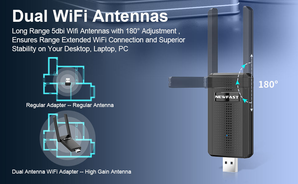 【2X High Gain Antennas】wifi adapter use the MU-MIMO technology , allows serve multiple devices at the same time, so that each device can get the maximum network speed. 2X5dBi high gain antennas, 180° angle adjustable, to achieve wider network coverage, more stable connection, stronger penetration.