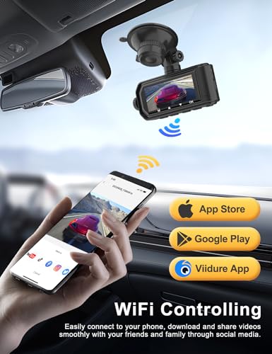 - 【Dash Camera with WiFi and Smart APP Control】This delicate car camera comes with WiFi function and free viidure APP(Work with Android and iOS devices). Connecting to your mobile phones easily through built-in WiFi, it is intuitive to change settings and easy to control this dashcam, view, download and share videos smoothly with your friends through social media.