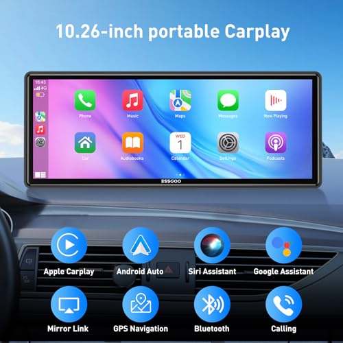 ESSGOO 10.26 Inch Wireless CarPlay & Android Auto Display, HD IPS Touchscreen with Mirror Link, Bluetooth Hands-Free Calling, Siri & G-oogle Assistant Support – Compatible with Various Vehicle Models
