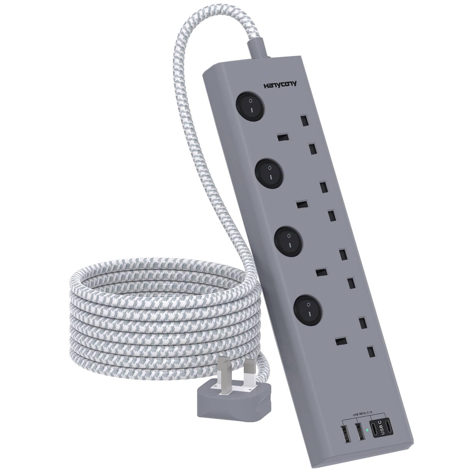 Extension Lead with 4 USB Slots(2 USB C), HANYCONY 4 Way