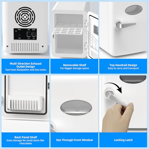 - 4L Mini Fridge: Compact yet mighty, the Vexloria Mini Fridge has a 4L capacity. It can store up to 6 cans, providing sufficient space for your beverages. Moreover, it serves as an ideal storage for delicate skincare products, makeup, cosmetics, and small snacks, adapting to a wide range of cooling needs.