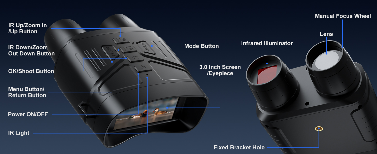 【10000mAh Rechargeable Night Vision Binoculars】Built for endurance: The IP65 waterproof tactical gear features a 10000mAh lithium battery (20+ hours runtime) and survives extreme weather/terrain. Use the Type-C port to export footage or attach a tripod(not included) for hands-free recording. Ideal for outdoor adventures like hiking, boating, or cave exploration.