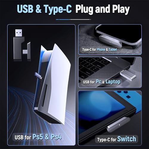 - ⚠️The 2 in 1 USB transmitter needs to be combined to connect PS5/PS4/PC/Laptop, can't be used separately; all modes are not compatible with all Xbox devices; the microphone is not available when connected to the Switch.
