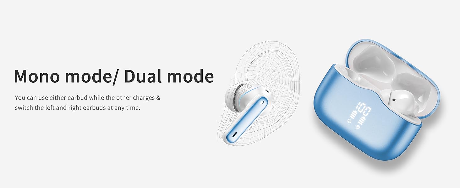 - 40H Long Battery Life and Independent LED display: These wireless earphones offer up to 8 hours of playback on a single charge, and with the charging case, the total playback time extends to 40 hours. The independent LED display shows the battery level and charging status in real time, making it easy to monitor the remaining charge. With Type-C fast charging, the charging case fully charges in just 1.5 hours (Note: Please fully charge the noise cancelling earbuds before first use)