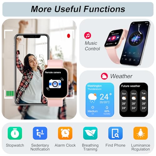 - 20+ Practical Functions & 30 Days Standby Time: This smartwatch contains more practical functions, fitness watch (pedometer, calories, activity distance), women's health, breathing training, stopwatch, timer, music control, camera control, weather forecast, sedentary reminder, calculator, calendar, Gmail, alarm clock, find phone, flashlight, etc. With only 1.5-2 hours of charging time, the smart watches offers a usage time of up to 5-7 days and a standby mode of 30 days.