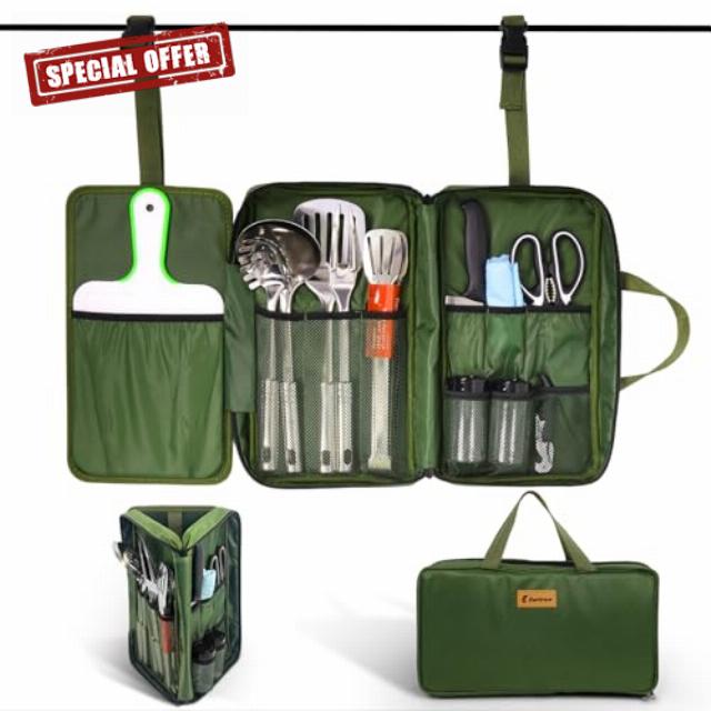 E EASTSTORM Camping Accessories Kitchen Utensil Set,12 Pcs Organizer Travel Kit with Multifunctional Cutlery,Stainless Steel Spoon Spatula,Tongs,Waterproof Storage Bag,Equipme