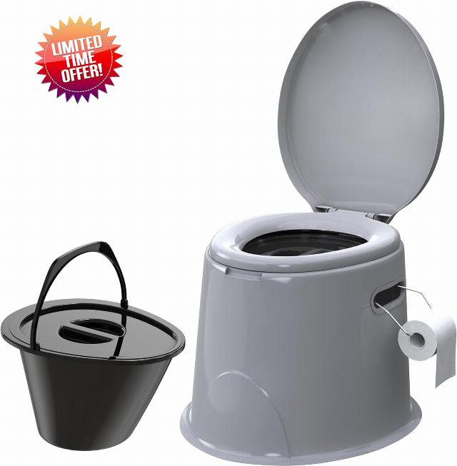Lightweight and Portable 5L Camping Toilet with Seat, Lid, Handles Washable Basket and Roll Holder Compact Potty Loo Waste for Indoor and Outdoor Loo Caravan Picnic Pool Party and Festivals Grey
