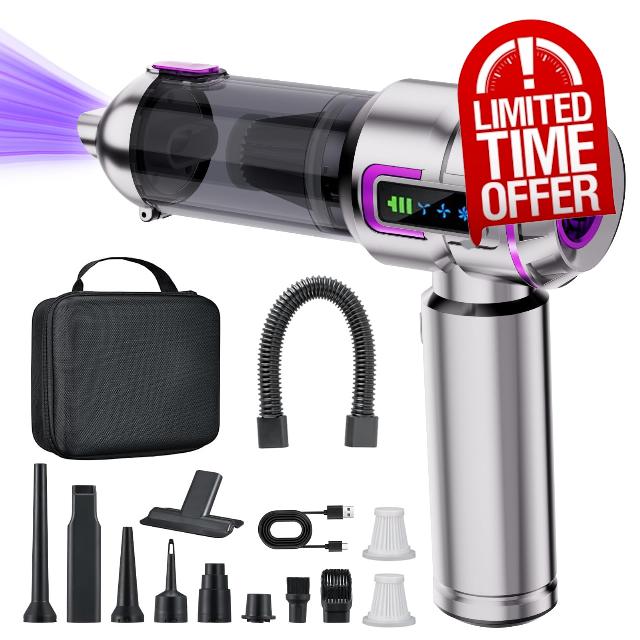 【Attachment function & application scenario】This cordless hand-held vacuum cleaner is equipped with a variety of attachments, that is, four main functions ofing/blowing/vacuum sealing/inflating, vacuuming is mainly used for window sills, vehicles and other hard-to-reach places, we added a flexible according to customer suggestions, so that cleaning is more thorough. The blowing is up to 220,000RPM times per minute, which can be used to clean computers keyboards, air conditioners and other devices, and the inflatable nozzle can be used to inflate balloons, swimming rings and other items, multi-scene use