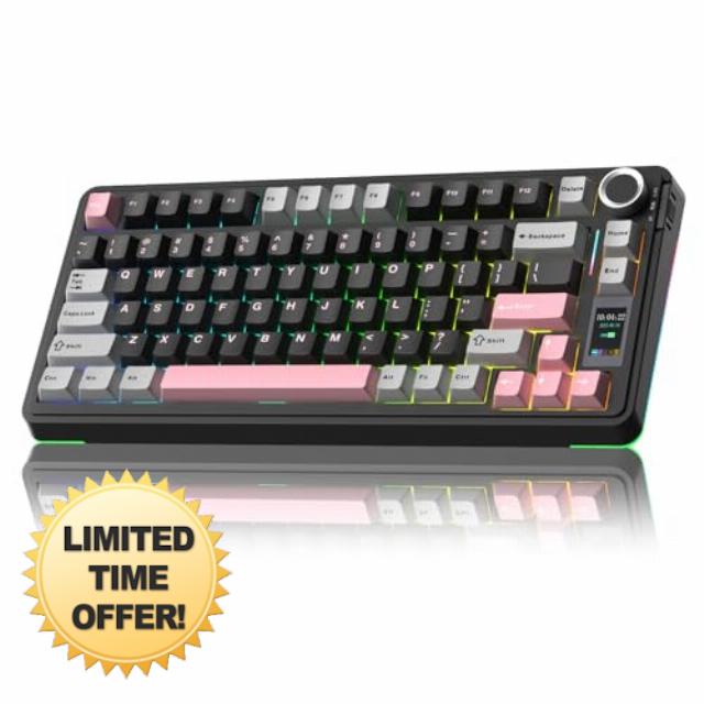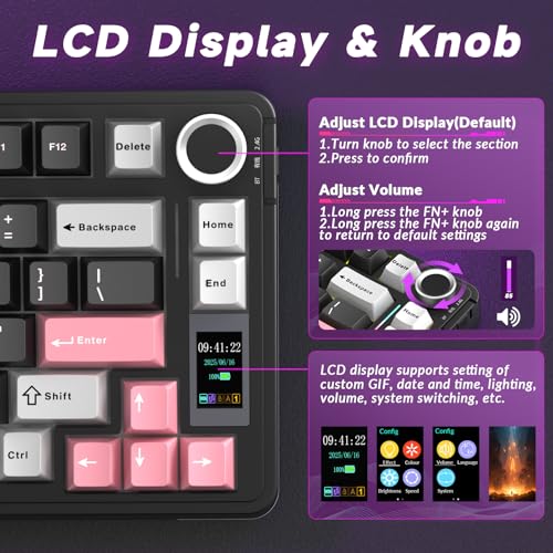 LCD Screen and Multi-Function Knob:This 75% mechanical keyboard equipped with built-in TFT display and Multi-function knob, serving as your interactive interface for real-time updates and customization.Convenient operation language selection, system switching, volume adjustment, time and date settings, RGB backlight settings, and battery power display. GIFs can also be customised via the driver. Make this wireless gaming keyboard even more fun and truly personalised