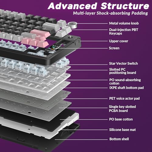 Five-Layer Sound-Absorbing Padding:S75 Pro creamy keyboard features a five-layer padding structure to eliminate noise and vibrations.The combination of poron foam, IXPE switch pad, PET sound enhancement pad and a bottom silicone pad ensures a premium typing experience.Whether you prefer a silent office environment or an immersive gaming atmosphere, the optimized internal construction delivers smoother keystrokes, creamy sound, and enhanced durability—making every press satisfyingly precise