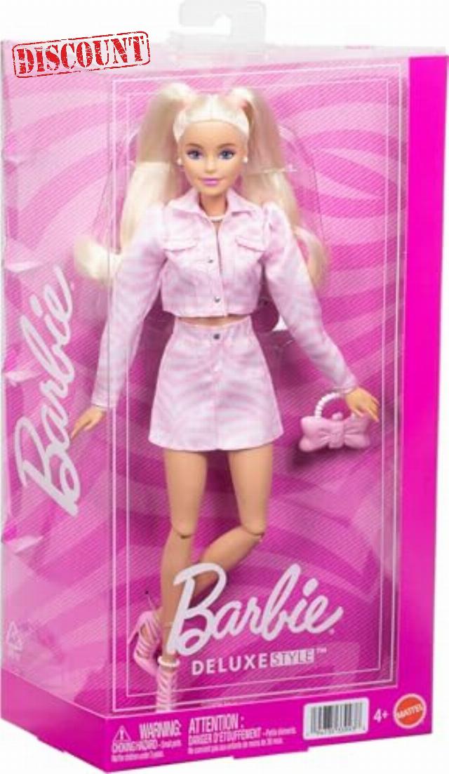 Barbie Deluxe Style Doll #9 in Pink Denim Outfit, Blonde Hair, Matching Jacket and Skirt Set with Accessories like Bow Clutch and Pearly Jewelry, JJN69