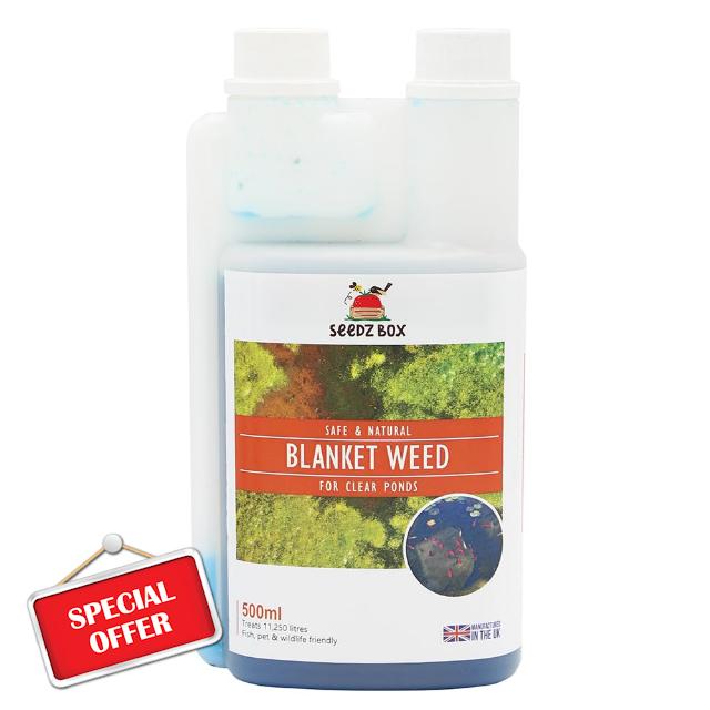 Blanket Weed Treatment For Ponds 500ml – Natural Pond Clear Water Treatment – Anti-Blanket Weed & Double Action Algae Control With Flocculant – Safe for Fish Plants & Wildlife – Seedzbox. Double Action Blanket Weed Control – Effectively tackles green water and blanket weed using advanced hydro gel flocculant technology to bind and sink algae for a clearer, healthier pond. Natural & Safe Formula – Made with environmentally responsible ingredients; safe for fish, plants, and wildlife when used as directed – ideal for garden ponds and small lakes. Restores Biological Balance – Helps prevent algae overgrowth which can damage aquatic plants, reduce oxygen levels, and harm fish – supports a balanced and thriving pond ecosystem. Instructions: 1) Shake the bottle. 2) Remove the cap which is not on the measuring chamber. 3) Squeeze the bottle gently until you reach the required level on the measuring chamber. 4) Use 10ml per 225 litres or 50 gallons of water. 5) Treat weekly if you have problems then every 2 weeks during the spring and summer term. Instructions: 6) This product contains a flocculant, which causes the algae to adhere together and sink to the bottom of the pond. 7) This product, when used as directed, is completely safe for aquatic life and is designed solely for use in ponds and lakes. Because we use a flocculant agent, we are legally obliged to add labelling stating it could be harmful to aquatic life. This product is designed to be used in ponds and lakes and the flocculant agent we use is in extremely low levels to make this product effective and is in no way a danger to pond life.