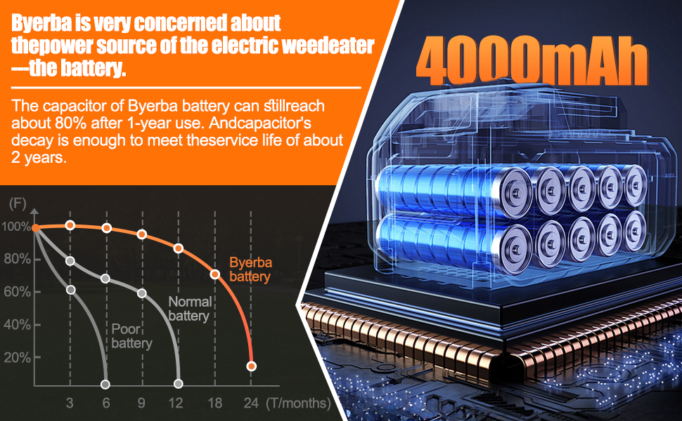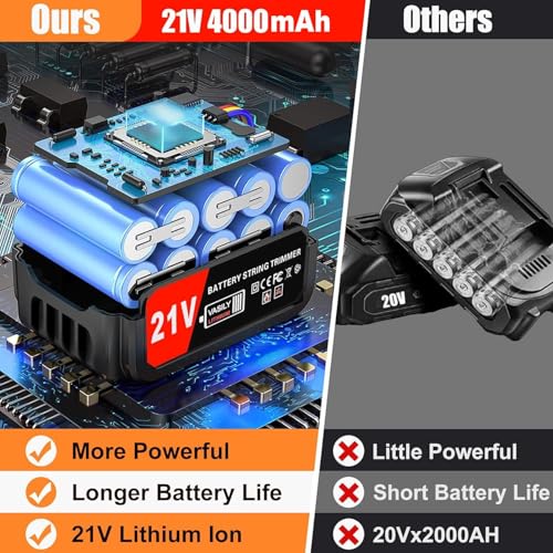 2. Cordless strimmer Each battery 4000mAh batteries. Two batteries meet the needs of daily work and can be charged 1000 times without damaging the battery. One 4.0Ah battery is equal to two 2.0Ah batteries.