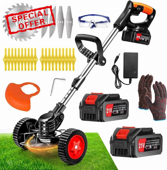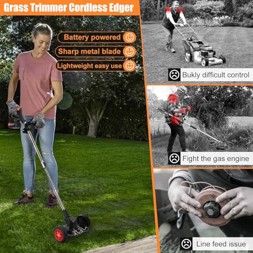 - Light Weight & Easy To Us: Garden strimmer cordless weight is only 3.96 pounds but sturdy,even the elderly or women can easily control and use it, with removable wheels, weeding is as easy as walking,mproving work efficiency, saving time and effort. The length can be adjusted to meet the needs of most people's garden pruning work.