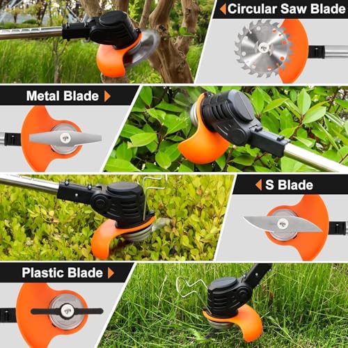 - Multifunctional Strimmer: This battery strimmer has 3 types of blades, cordless grass trimmer suitable for different scenarios. Metal circular blades can cut branches and hard bushes, stainless steel blades can cut weed piles and thicker grass in complex terrain, and 20 plastic blades can be used to trim lawn tender grass or lawn edge. You can use it in gardens, villas, parks, pastures, courtyard lawns, weed piles, bushes, especially for home gardens.