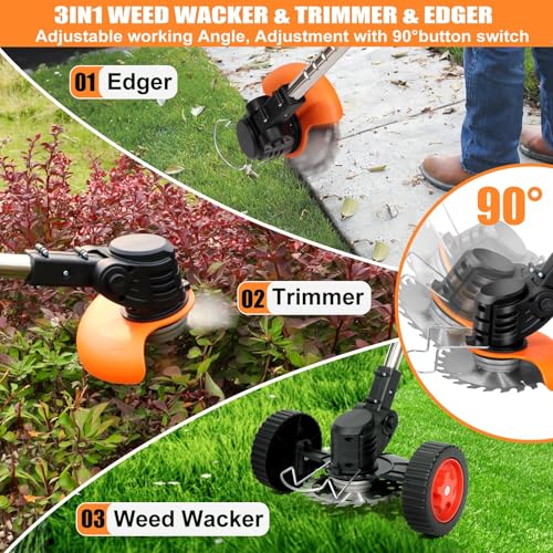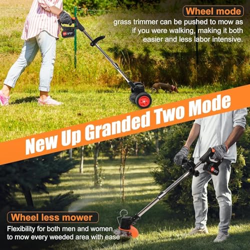 - Powerful Grass Strimmer Cordless: Cordless strimmer with 850W high power pure copper motor. 18000 rpm no-load speed(6000 rpm work speed), achieve large operations under small machines.The Cordless strimmer battery powered is multiple functions in one: grass trimmer, edger, lawn mower, easy for different cutting jobs, not limited by wires, you can mow anywhere.