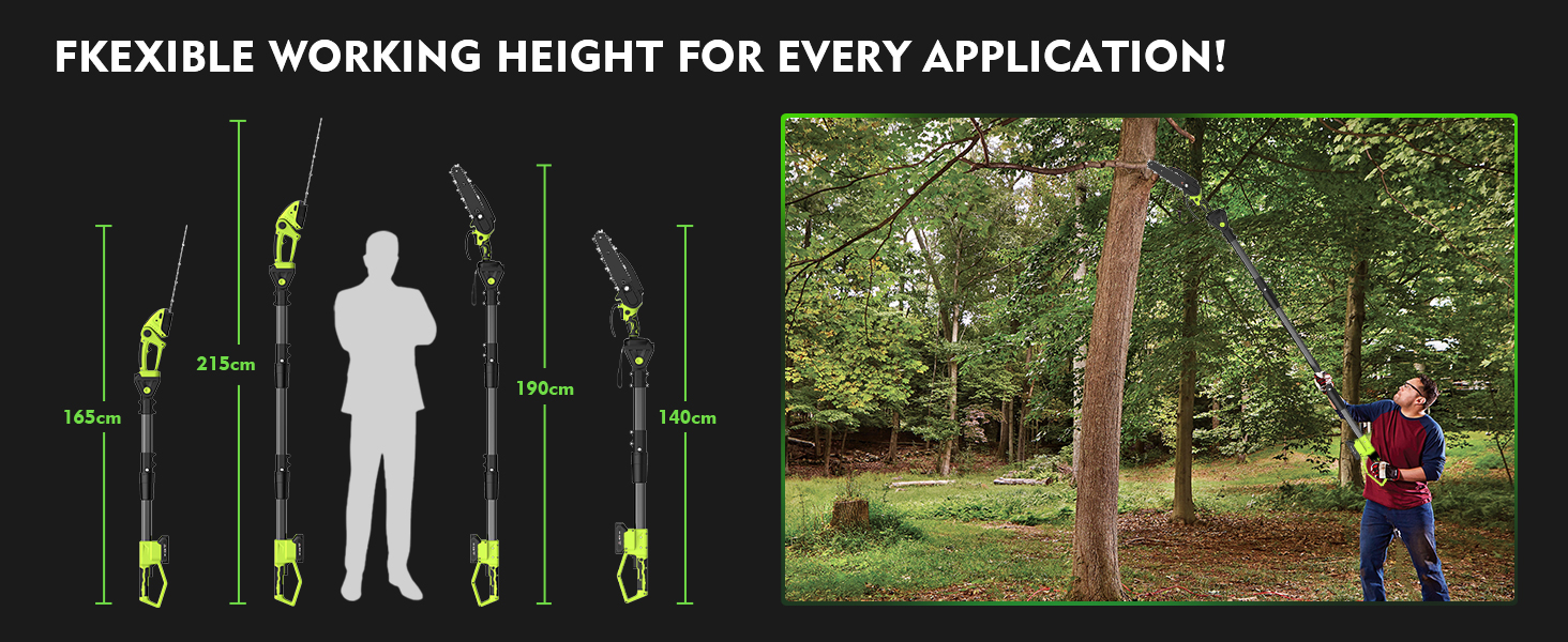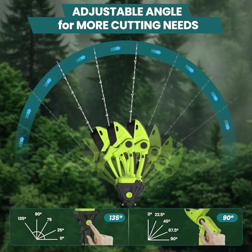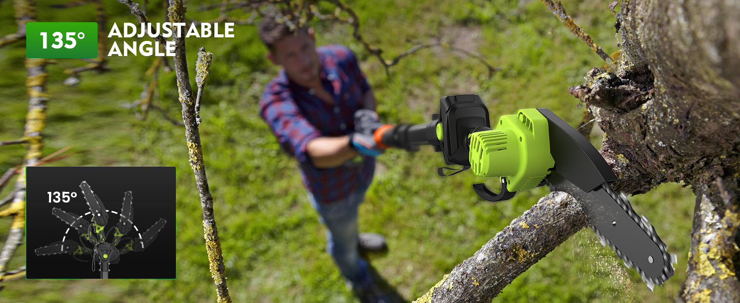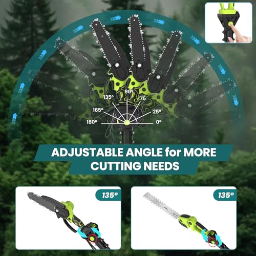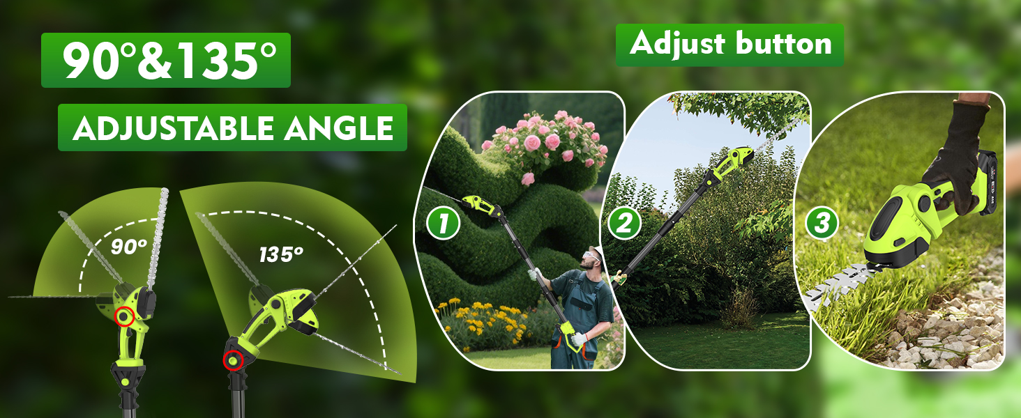 - ✅ Adjustable Cutting Angle and Extension Pole ✅ The pole saw adjusts from 0-135°, while the pole hedge trimmer offers 90°/135° angle adjustments. With the included extension pole, the long reach hedge trimmer has a reach of 165/215cm, while the pole saw has a reach of 140/190cm, allowing for precise trimming of high branches and areas that are typically difficult to reach. Say goodbye to tedious manual pruning and enjoy effortless and efficient pruning.