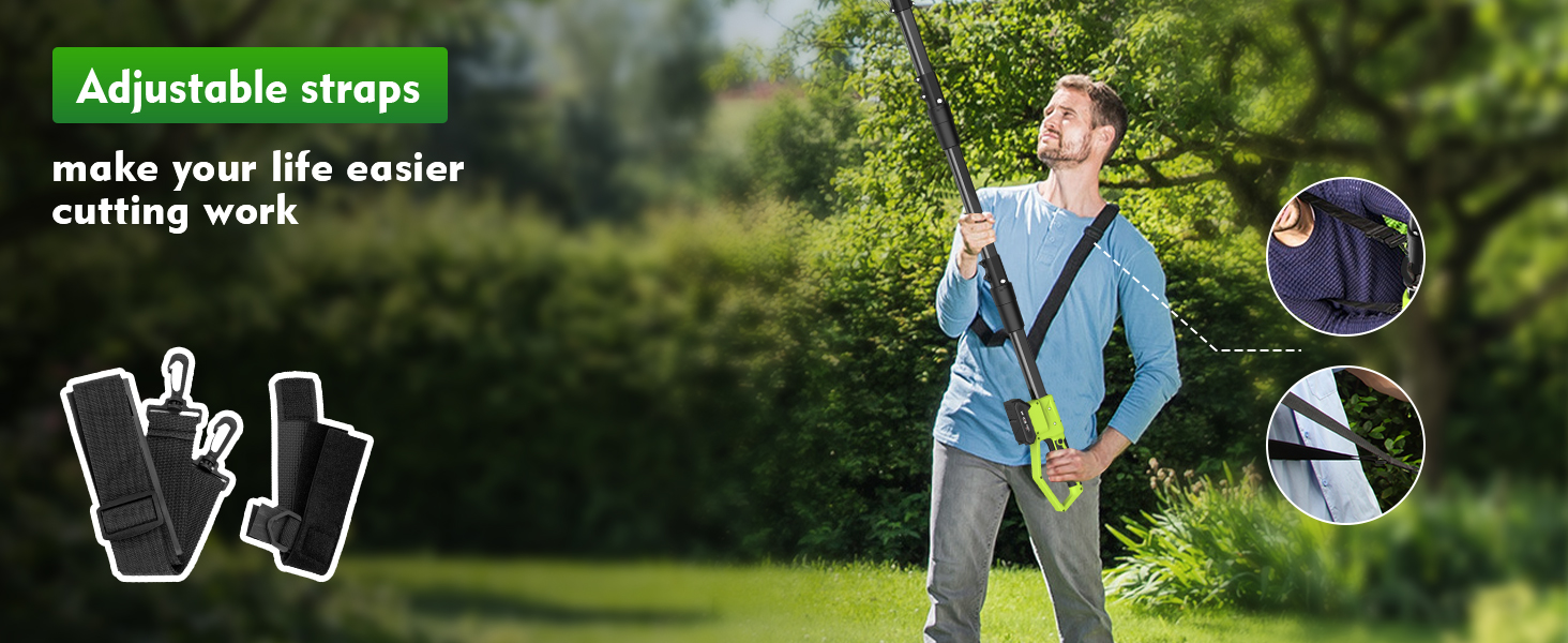 - ✅ Ergonomic Design ✅ The handle of this cordless pole hedge trimmer is ergonomically designed. The soft, rubber-wrapped handle is non-slip and shock-absorbing, providing a comfortable grip throughout the entire cutting process. It also comes with a glove for added safety. The unique shoulder strap ensures even weight distribution, allowing you to work worry-free for hours.