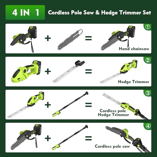 - ✅ 4-in-1 Multifunctional Set ✅ This 4-in-1 pole hedge trimmer and chainsaw helps you easily cut and trim high, hard-to-reach hedges, shrubs, and branches. It also helps you quickly, efficiently, and accurately cut logs, trim low hedges, and lawns. Its versatile features make it ideal for pruning tall trees, shaping hedges, and managing large gardens.