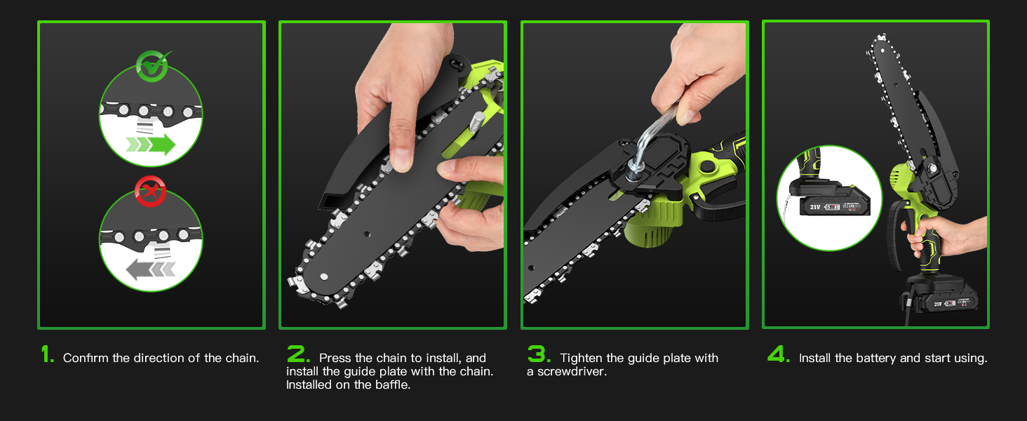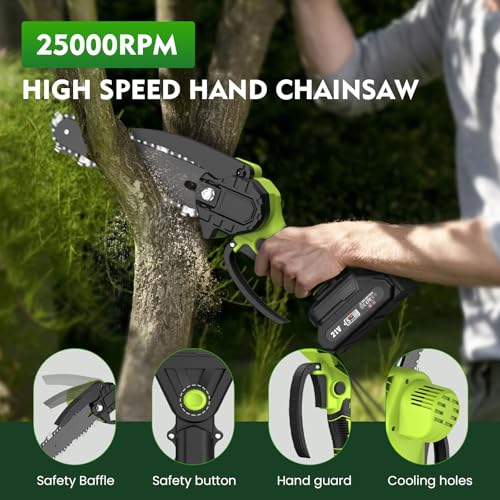 - ✅ Rechargeable Battery✅ This long-reach chainsaw is equipped with two 4000mAh rechargeable batteries, which fully charge in just 1.5-2 hours and provide up to 50 minutes of use. The large battery capacity and long battery life allow you to perform your desired trimming tasks with peace of mind. The included charger allows you to swap between two batteries, allowing you to charge whenever you need to without interrupting your trimming work.