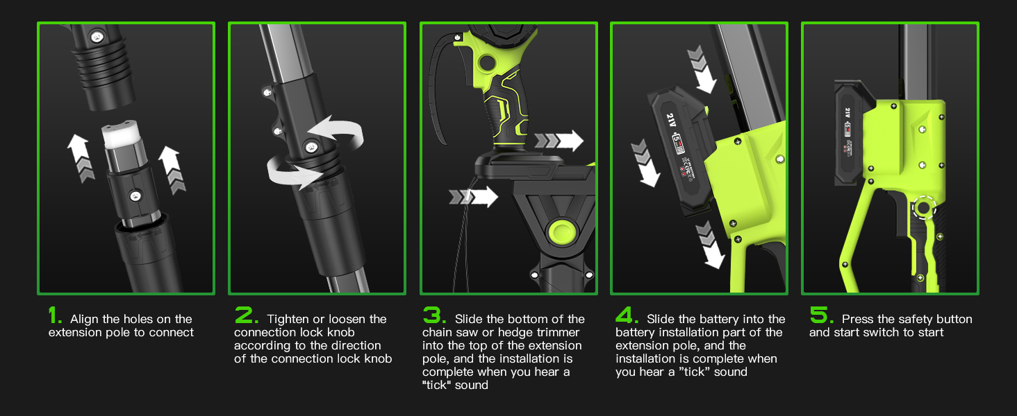 - ✅ Multiple Safety Features ✅ The pole extension chainsaw/hedge trimmer features a safety guard and hand guard to protect your face or hands from flying debris. The locking mechanism prevents the saw/hedge trimmer from falling while maintaining stable cutting. It only activates when you press the safety switch and power button simultaneously, preventing accidental activation. Safety goggles and cut-resistant gloves are included for comprehensive protection and safe use.
