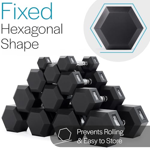 - ANTI-ROLL HEXAGONAL PLATES: Fixed hexagonal-shaped plates prevent the dumbbells rolling along the ground. Keeps them within easy reach if you're doing circuits or supersets and makes them great for dumbbell push-ups. Also allows you to easily stack and store them with other hex dumbbells.