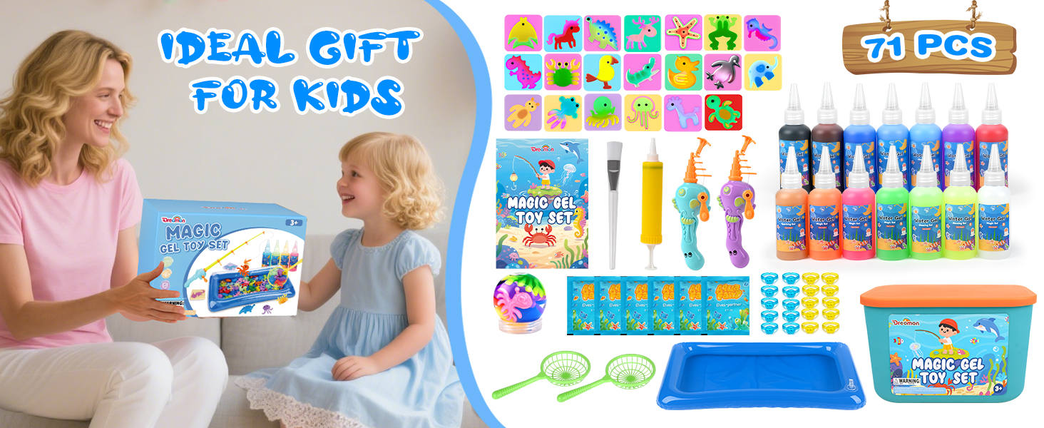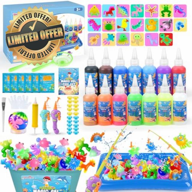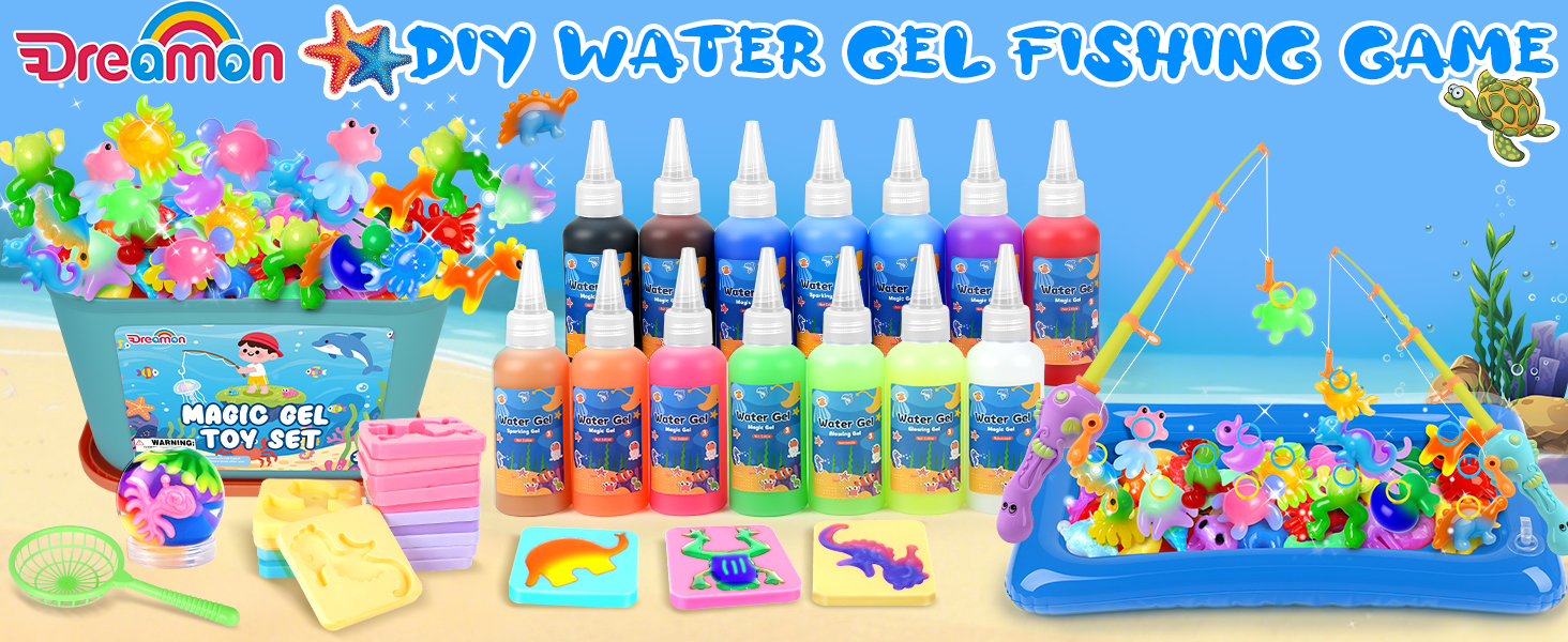 - 【Create a Magical Ocean World】Dreamon aqua fairy water gel kit for kids includes 14 gels (10 solid colors, 2 pearlescent colors, 2 luminous colors), 20 molds, 1 storage box, 6 calcium chloride packets, 2 fishing rods, 1 inflatable fish pool, and more. With endless combinations and imaginative possibilities, kids can build their very own magical ocean world while enjoying the double fun of hands-on crafting and creative storytelling.