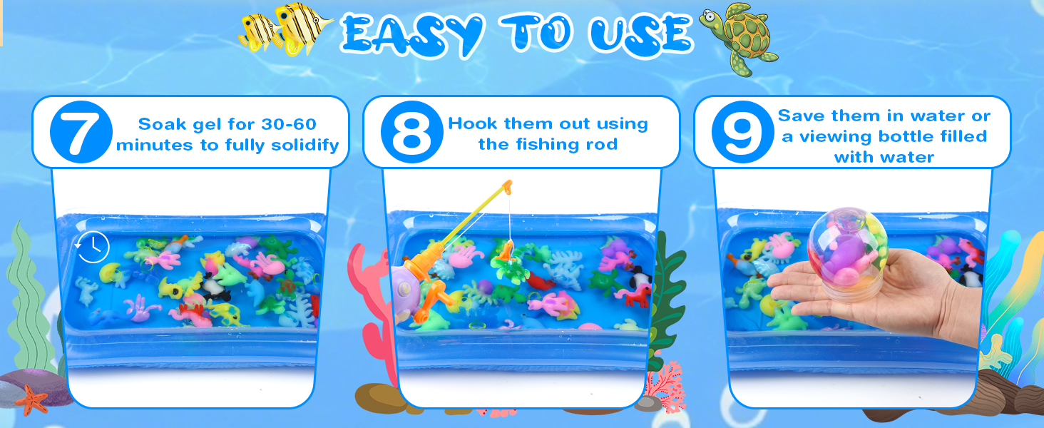 - 【Brand-New DIY Aqua Fairy Fishing Experience】Fill the colorful gel into the molds, submerge them in calcium water for about 30 seconds to quickly form, then gently shake to release. Dreamon has added kid-sized fishing rods and crystal rings to turn your child into a little “fishing expert.” Children can enjoy fun competitions with friends or family to see who can fish the fastest, offering a truly lifelike and exciting pretend fishing experience.