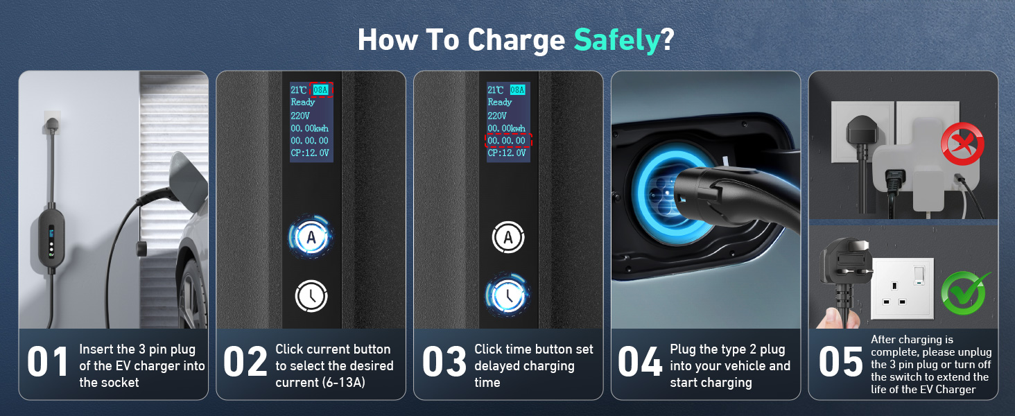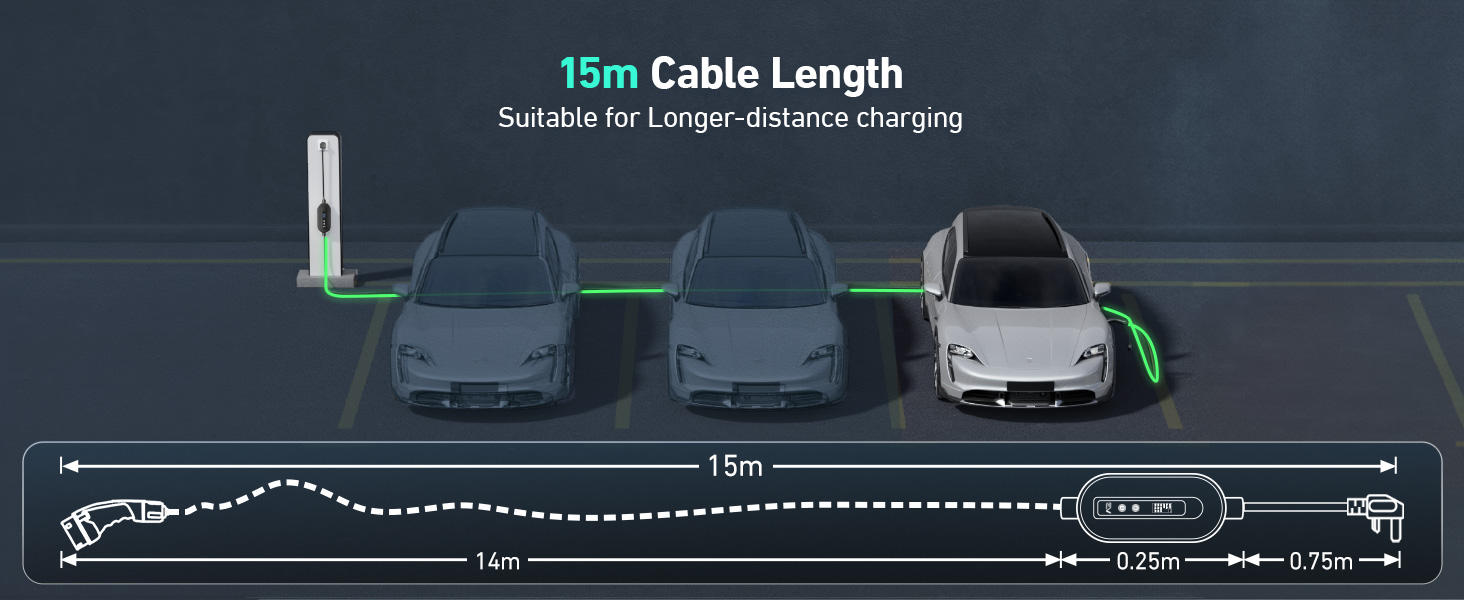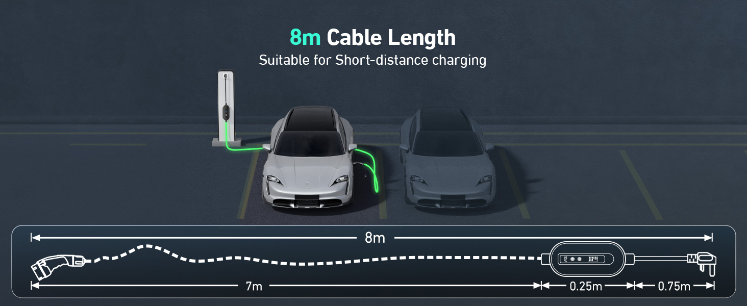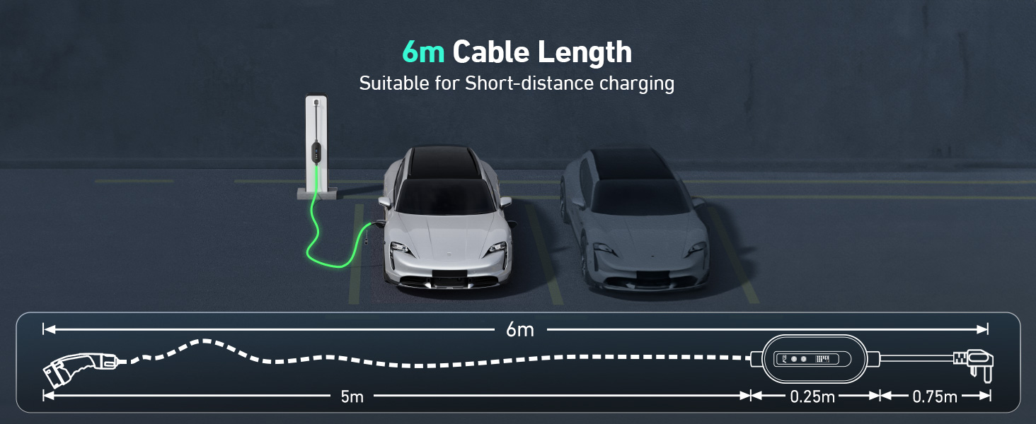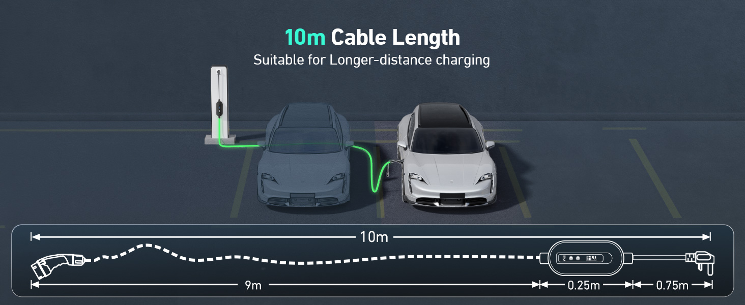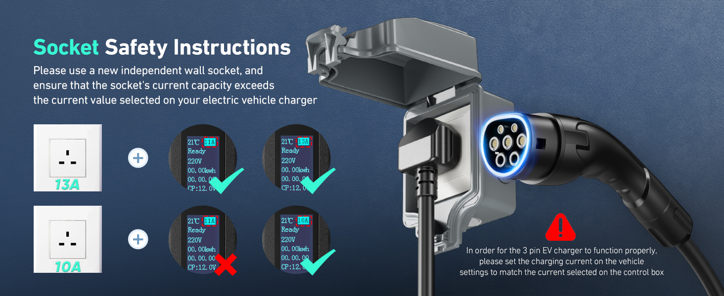 Notes: 1. To ensure optimum safety, it is recommended to use a new 13A dedicated electric vehicle charging socket. Please also avoid using with extension cbales or adaptor 2. When charging, please fully extend the cable to prevent heat buildup. If notice overheating during charging, stop charging first, then adjust the current settings to a lower level before attempting again 3. Before selecting length, measure the actual distance and allow an extra 2–3 metres to ensure flexibility during installation and use