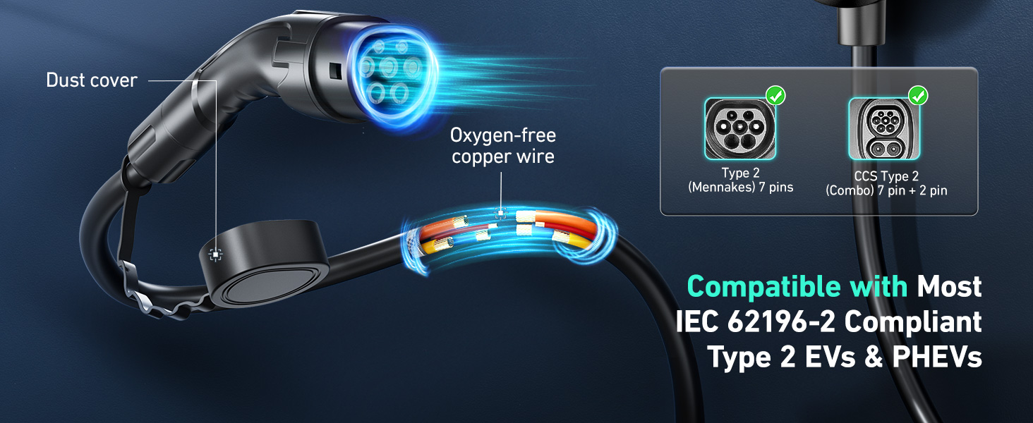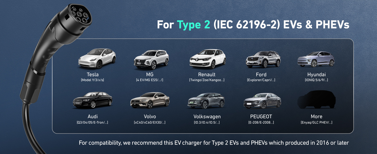 【Wide Compatibility】 The EV charger cable type 2 to 3 pin plug is compatible with most Type 2 EVs&PHEVs produced after 2016 and compliant with the IEC 62196-2 standard (please check if your vehicle's charging port is Type 2). If you are unsure about compatibility, feel free to ask us at any time