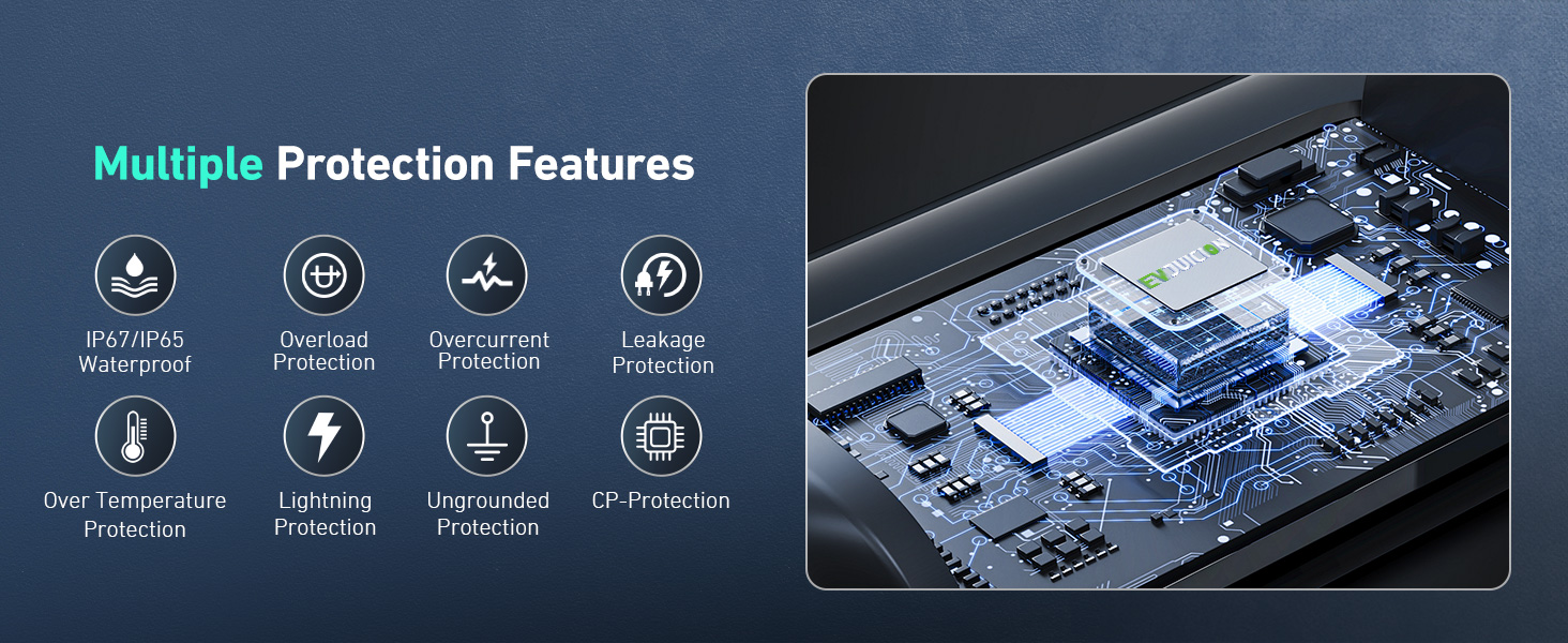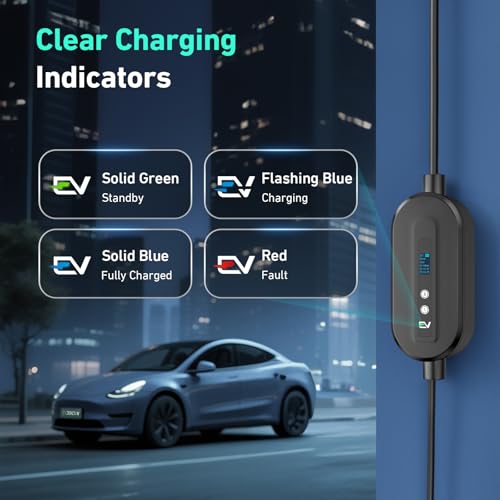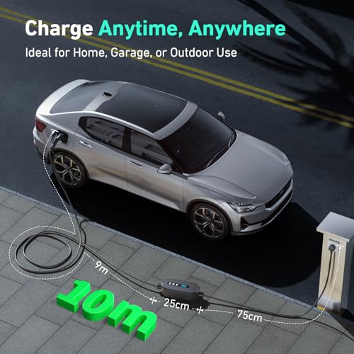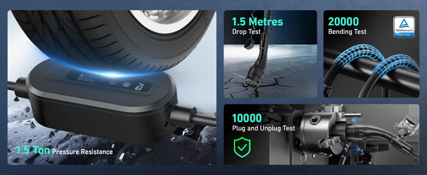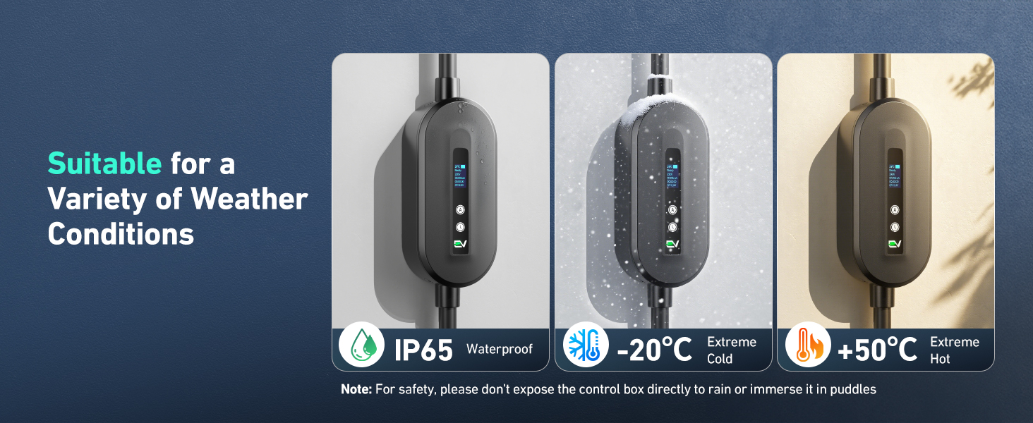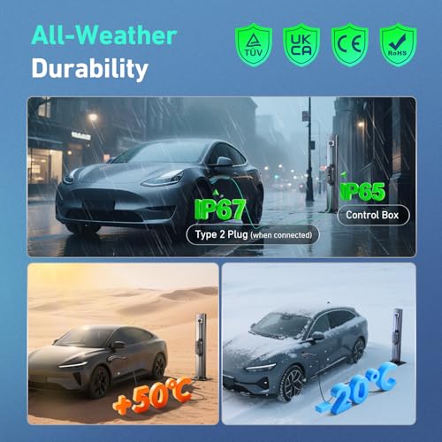 【Safe and Reliable】 The EV charger 3 pin plug is certified by CE, UKCA, UL, with multi-layered safety protections, supports automatic power cutoff upon full charge to prevent overcharging. The control box is made of premium PC+ABS material, offering pressure resistance and drop protection. The Flame Retardant Grade UL94-V0 TPU cable has passed 20,000 bend tests. The Type 2 plug withstands 10,000 insertion/removal tests for enhanced durability. The IP65 control box and IP67 type 2 plug (when plugged in), making it suitable for a variety of environments. Note: Do not use directly exposed to rain, snow, or standing water. For prolonged outdoor use, install a rain cover to ensure safety