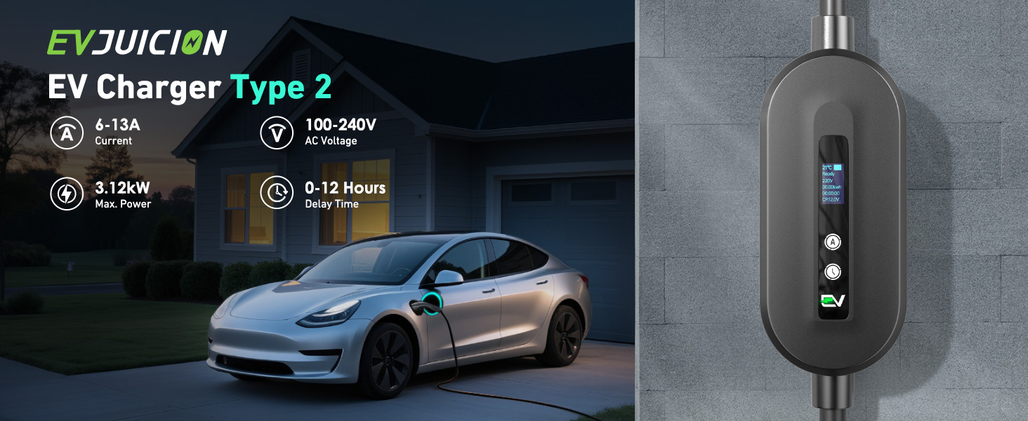 EVJUICION EV Charger Cable Type 2 to 3 Pin Plug 10M, [3kW, 6-13A] EV Charger 3 Pin Plug 0-12H Delay Timer, Type 2 Charging Cable 3 Pin with LED Display & Carry Bag, IP67/IP65 for Type 2 EVs & PHEVs