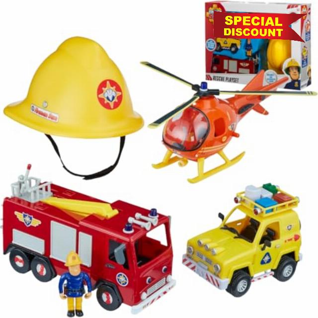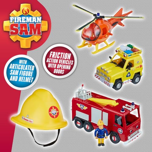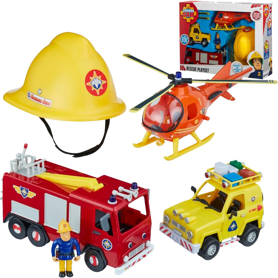 - Complete Fireman Sam Adventure Set – Authentic Fireman Sam rescue playset featuring Sam’s iconic Jupiter fire engine, Wallaby One helicopter, and a 4×4 rescue truck, plus a Fireman Sam action figure and child-sized firefighter helmet. Everything kids need for epic Pontypandy rescue missions!