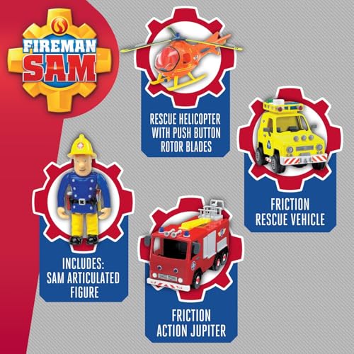 Fireman Sam Rescue Playset with Jupiter Fire Engine, Helicopter, 4×4 Truck, Helmet & Sam Figure – Friction-Powered Vehicles Toy Set for Kids Age 3+