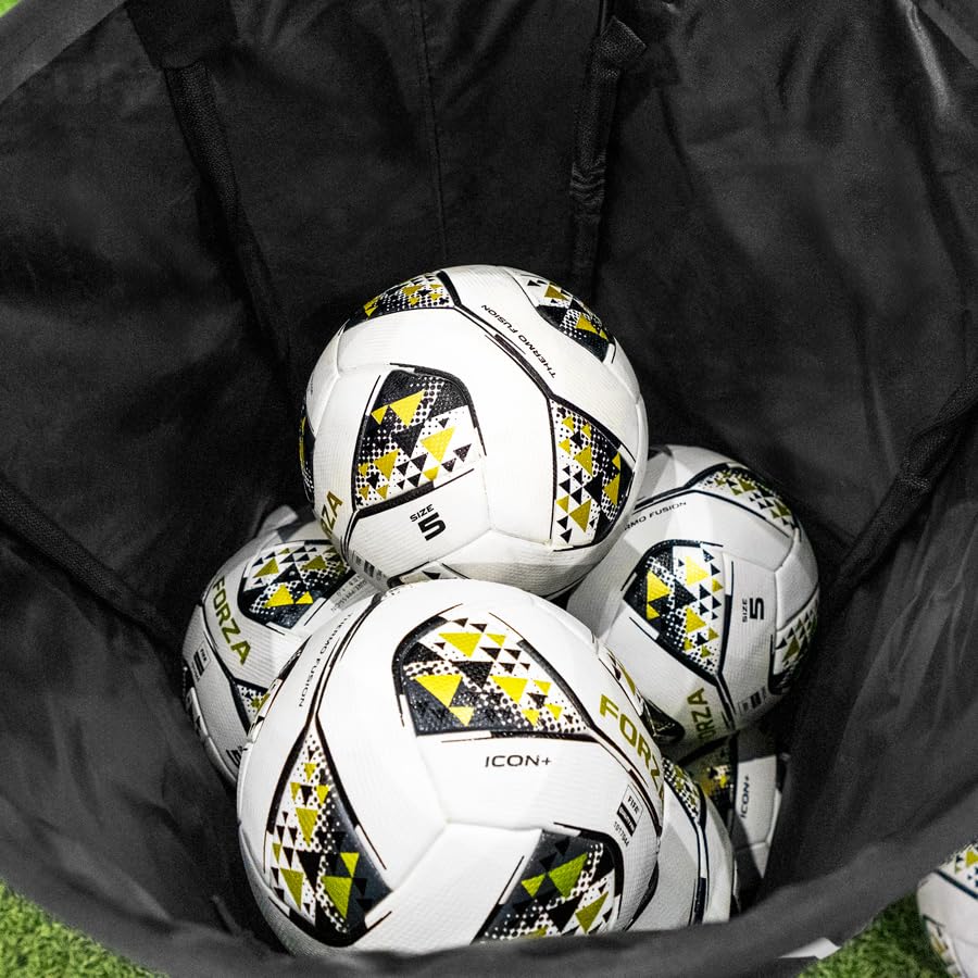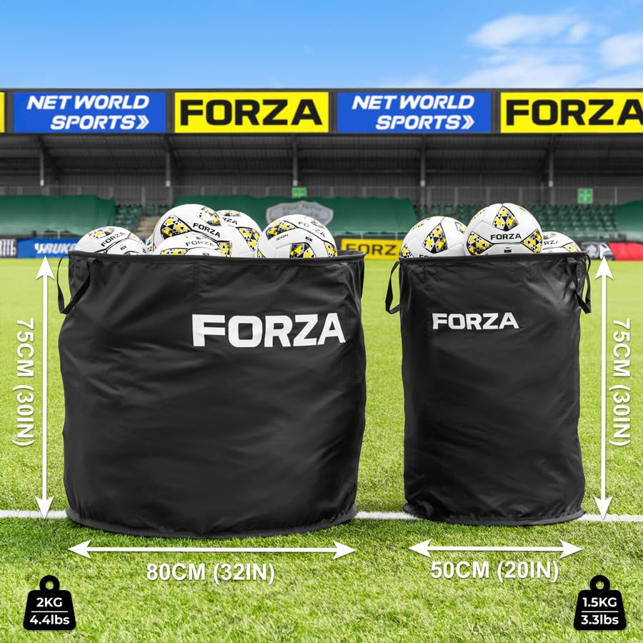DIMENSIONS: 50cm x 75cm Ball Bin: Size: 50cm x 50cm x 75cm | 20in x 20in x 30in (L x W x H) Weight: 1.5kg | 3.3lbs Capacity: Fits up to 17 size 5 footballs 80cm x 75cm Ball Bin: Size: 80cm x 80cm x 75cm | 32in x 32in x 30in (L x W x H) Weight: 2kg | 4.4lbs Capacity: Fits up to 45 size 5 footballs MATERIALS: Durable 420D Oxford Fabric Heavy-duty Weaving Tape Flexible Fibreglass Poles MISCELLANEOUS: Includes 6 months warranty for peace of mind Multi-sport compatibility – ideal ball bin for football, futsal, rugby, basketball & more Collapsible frame allows for compact storage inside the included heavy-duty carry bag Ground anchors included for enhanced stability during trick shot training or windy conditions Versatile 2-in-1 design – use as a sports ball container or a trick shot target bin for fun & functional training Designed for year-round use – this portable ball storage bin is perfect for both indoor & outdoor training sessions Lightweight, foldable frame ensures easy transportation & fast setup – ideal for coaches & athletes on the go For an easy-to-follow, step-by-step guide on setting up your ball bin, please refer to our video guide PLEASE NOTE: To ensure long-lasting performance & protect against extreme weather conditions, we recommend storing the FORZA Ball Bin indoors when not in use