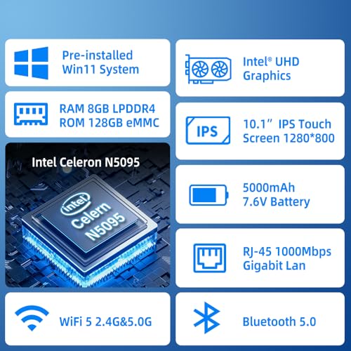 HEIGAOLAPC Mini PC Computer Mini Desktop PC 10.1 Inch Win 11 N5095, Mini-pc with Touchscreen, 8GB RAM, 128GB eMMC, 5000mAh Battery, Dual 4K Display Output, HDMI/WiFi5/BT5.0, Dual Rs232